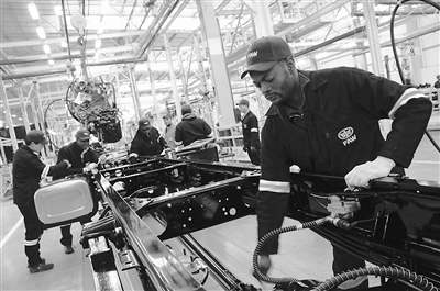 7月10日,在南非東開普省曼德拉灣市,工人在中國一汽南非工廠生產線上工作。新華社 圖