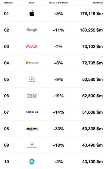 蘋果、谷歌價(jià)值上漲 可口可樂、IBM價(jià)值下跌