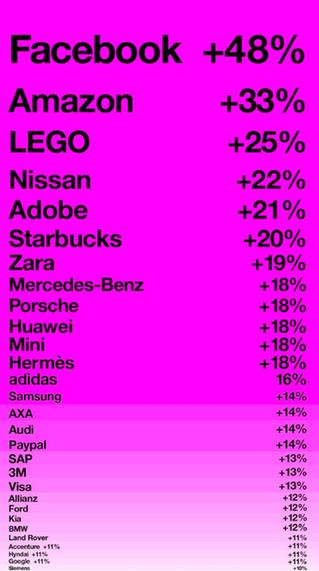 社交媒體Facebook,電商巨頭Amazon(亞馬遜)和玩具公司Lego(樂高)是2016年品牌價(jià)值增長最快的三大品牌(增速分別為 48%,33%,25%)。