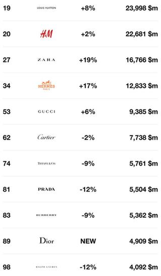 值得注意的是,快時(shí)尚仍然表現(xiàn)極佳,Zara 和 H&M 的品牌價(jià)值都高于一眾奢侈品牌,分別位列第 20 和 27。H&M的品牌價(jià)值等于4個(gè)Prada。