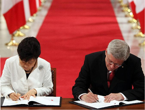 加拿大總理哈珀和正在這里訪問的韓國(guó)總統(tǒng)樸槿惠簽署《加拿大-韓國(guó)自由貿(mào)易協(xié)定》。